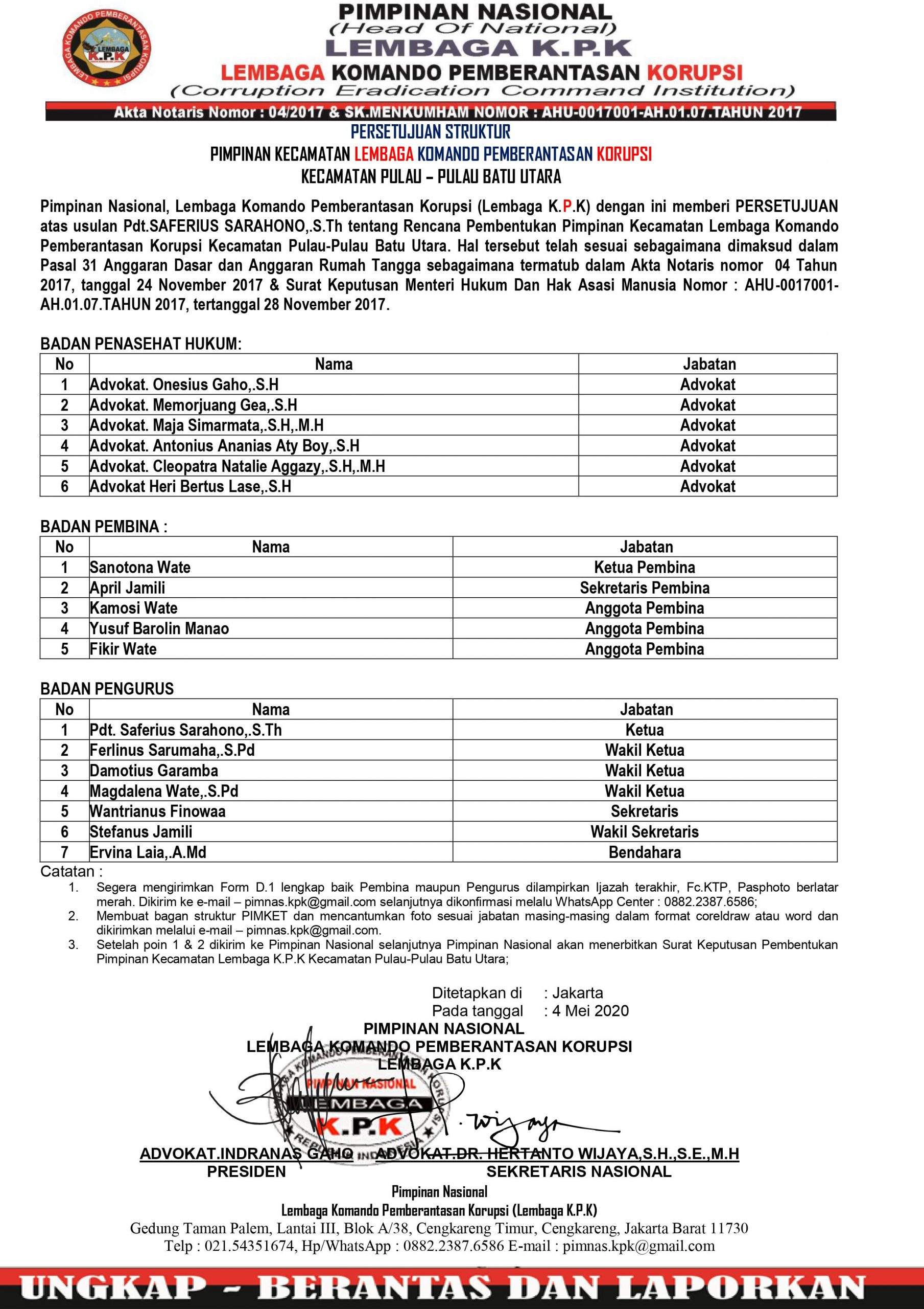 Hibala, 20 April 2020. Pimpinan Kecamatan (PIMKET) Lembaga Komando Pemberantasan Korupsi (Lembaga  K.P.K), Kecamatan Hibala resmi terbentuk berdasarkan Surat Keputusan Pimpinan Nasional Nomor : 02.0408.01-PK/SK/PIMNAS/LEM-K.P.K/IV/2020 tertanggal 20 April 2020,  Tentang Struktur Pimpinan Kecamatan  (PIMKET) Lembaga Komando Pemberantasan Korupsi (Lembaga K.P.K) Kecamatan Hibala, Kabupaten Nias Selatan – Provinsi Sumatera Utara Periode 2020-2022. Presiden Lembaga Komando Pemberantasan […]