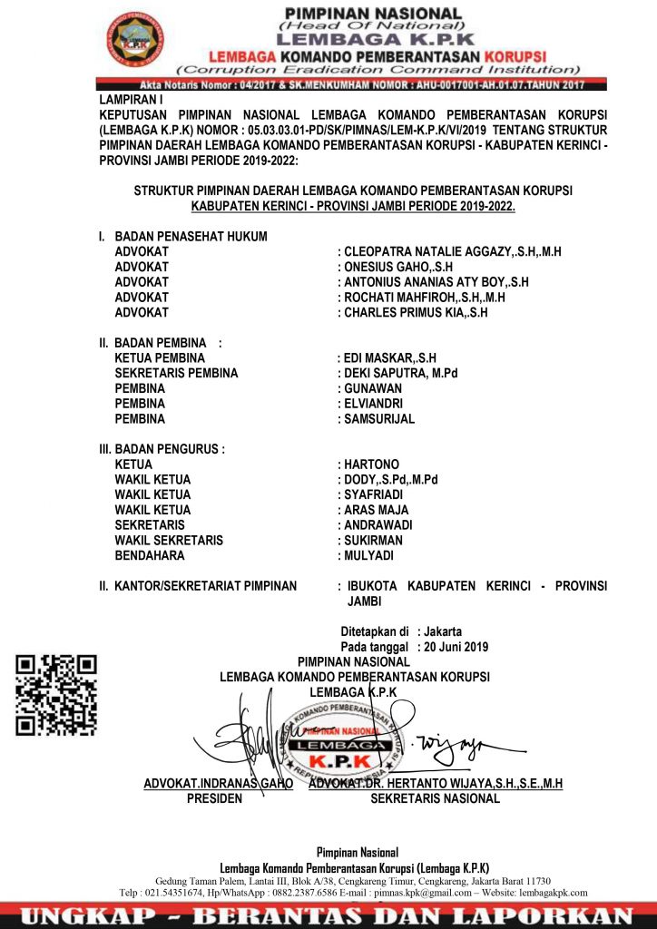 2. Bila Nama-nya tertuang dalam Surat Keputusan ini menunjukkan Tanda Pengenal Pimpinan (KTPP) dan Kartu Surat Tugas (KST) yang tidak berbarcode resmi terhubung pada link website ini maka KTPP dan KST tersebut TIDAK SAH & TIDAK BERLAKU;