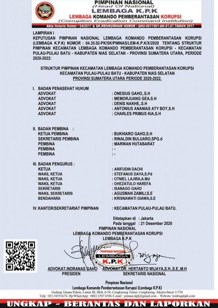 2. Bila Nama-nya tertuang dalam Surat Keputusan ini menunjukkan Tanda Pengenal Pimpinan (KTPP) dan Kartu Surat Tugas (KST) yang tidak berbarcode resmi terhubung pada link website ini maka KTPP dan KST tersebut TIDAK SAH & TIDAK BERLAKU;