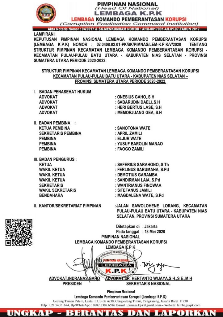 3. Bila menemukan pihak-pihak yang mengaku Lembaga Komando Pemberantasan Korupsi Kecamatan Pulau-Pulau Batu Utara namun tidak tercantum Nama-nya dalam Surat Keputusan ini maka yang bersangkutan adalah Gadungan dan dapat mengonfirmasi melalui Call Center di : 0882.2387.6586 (Wa dengan isi pesan : Nama_Kota Asal_Klarifikasi_Uraian Klarifikasi/Pengaduan)