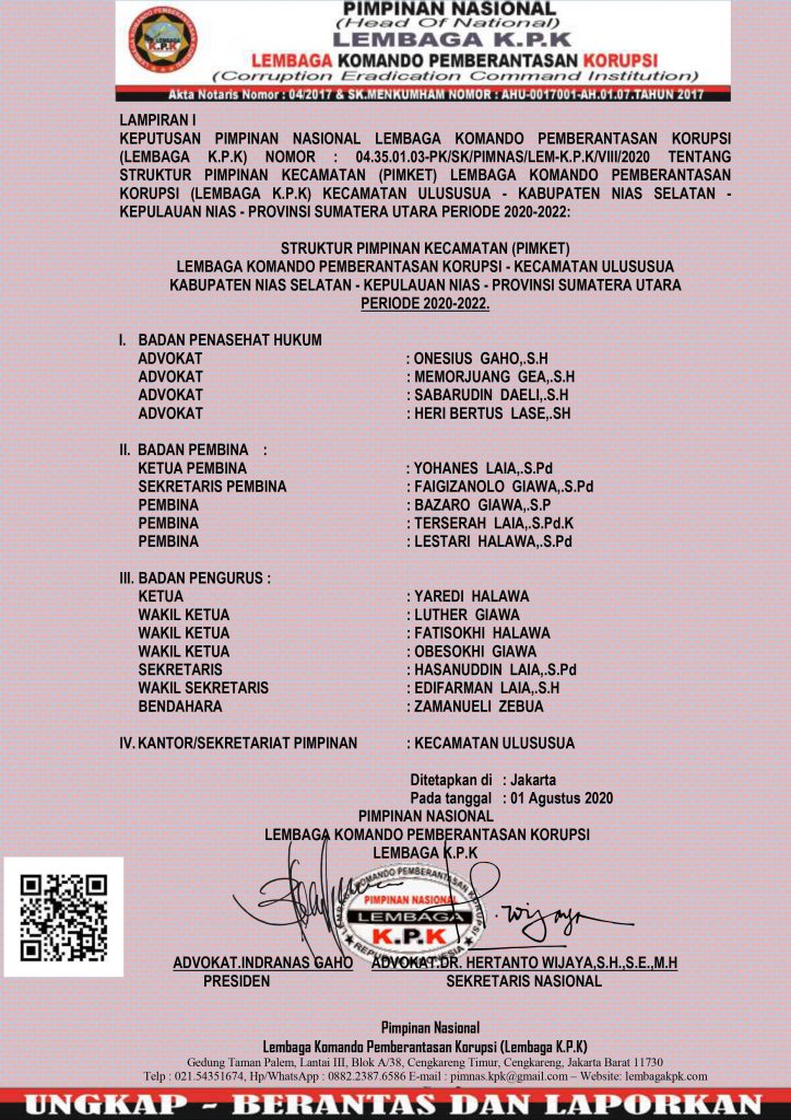 4. Bila menemukan pihak-pihak yang mengaku Lembaga Komando Pemberantasan Korupsi namun tidak tercantum Nama-nya dalam Surat Keputusan maka yang bersangkutan adalah gadungan dan dapat mengonfirmasi melalui call center di : 0882.2387.6586 (Wa dengan isi pesan : Nama_Kota Asal_Klarifikasi_Uraian Klarifikasi/Pengaduan)