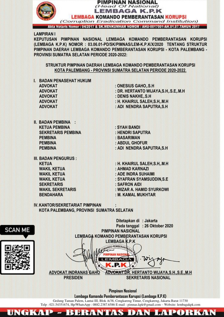 2. Bila Nama-nya tertuang dalam Surat Keputusan ini menunjukkan Tanda Pengenal Pimpinan (KTPP) dan Kartu Surat Tugas (KST) yang tidak berbarcode resmi terhubung pada link website ini maka KTPP dan KST tersebut TIDAK SAH & TIDAK BERLAKU;