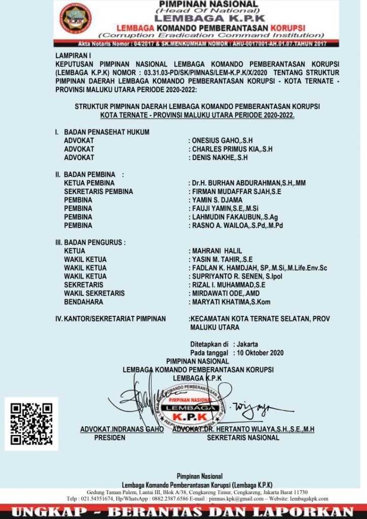 3. Bila menemukan pihak-pihak yang mengaku Lembaga Komando Pemberantasan Korupsi namun tidak tercantum Nama-nya dalam Surat Keputusan maka yang bersangkutan adalah Gadungan dan dapat mengonfirmasi melalui Call Center di : 0882.2387.6586 (Wa dengan isi pesan : Nama_Kota Asal_Klarifikasi_Uraian Klarifikasi/Pengaduan)