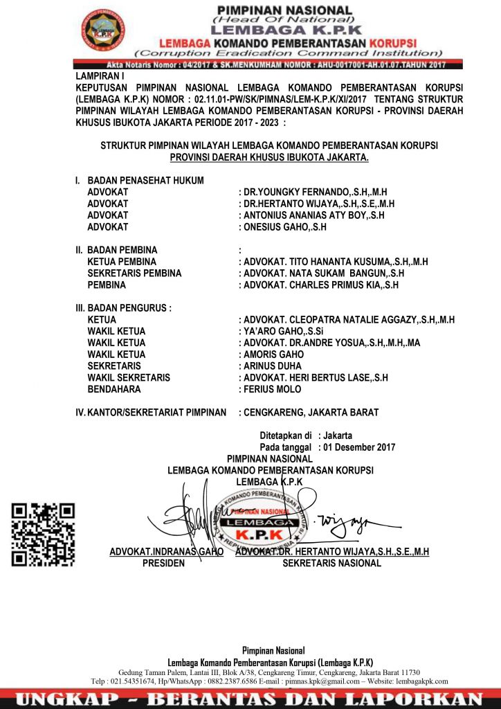 3. Bila menemukan pihak-pihak yang mengaku Lembaga Komando Pemberantasan Korupsi namun tidak tercantum Nama-nya dalam Surat Keputusan maka yang bersangkutan adalah Gadungan dan dapat mengonfirmasi melalui Call Center di : 0882.2387.6586 (Wa dengan isi pesan : Nama_Kota Asal_Klarifikasi_Uraian Klarifikasi/Pengaduan)