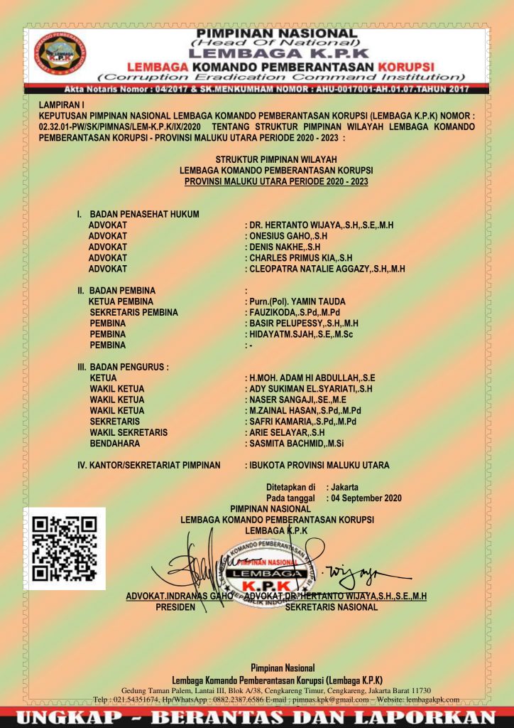 4. Bila menemukan pihak-pihak yang mengaku Lembaga Komando Pemberantasan Korupsi namun tidak tercantum Nama-nya dalam Surat Keputusan maka yang bersangkutan adalah Gadungan dan dapat mengonfirmasi melalui Call Center di : 0882.2387.6586 (Wa dengan isi pesan : Nama_Kota Asal_Klarifikasi_Uraian Klarifikasi/Pengaduan)