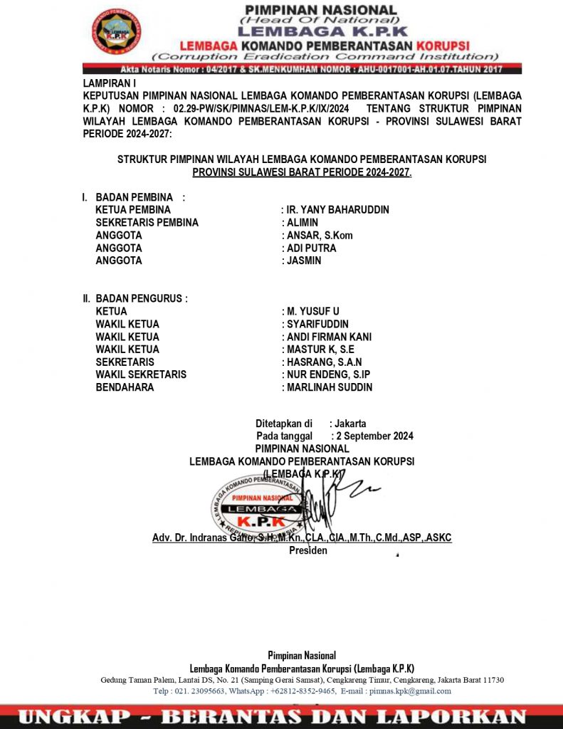 3. Bila menemukan pihak-pihak yang mengaku Lembaga Komando Pemberantasan Korupsi namun tidak tercantum Nama-nya dalam Surat Keputusan maka yang bersangkutan adalah Gadungan dan dapat mengonfirmasi melalui Call Center di : 0882.2387.6586 (Wa dengan isi pesan : Nama_Kota Asal_Klarifikasi_Uraian Klarifikasi/Pengaduan)